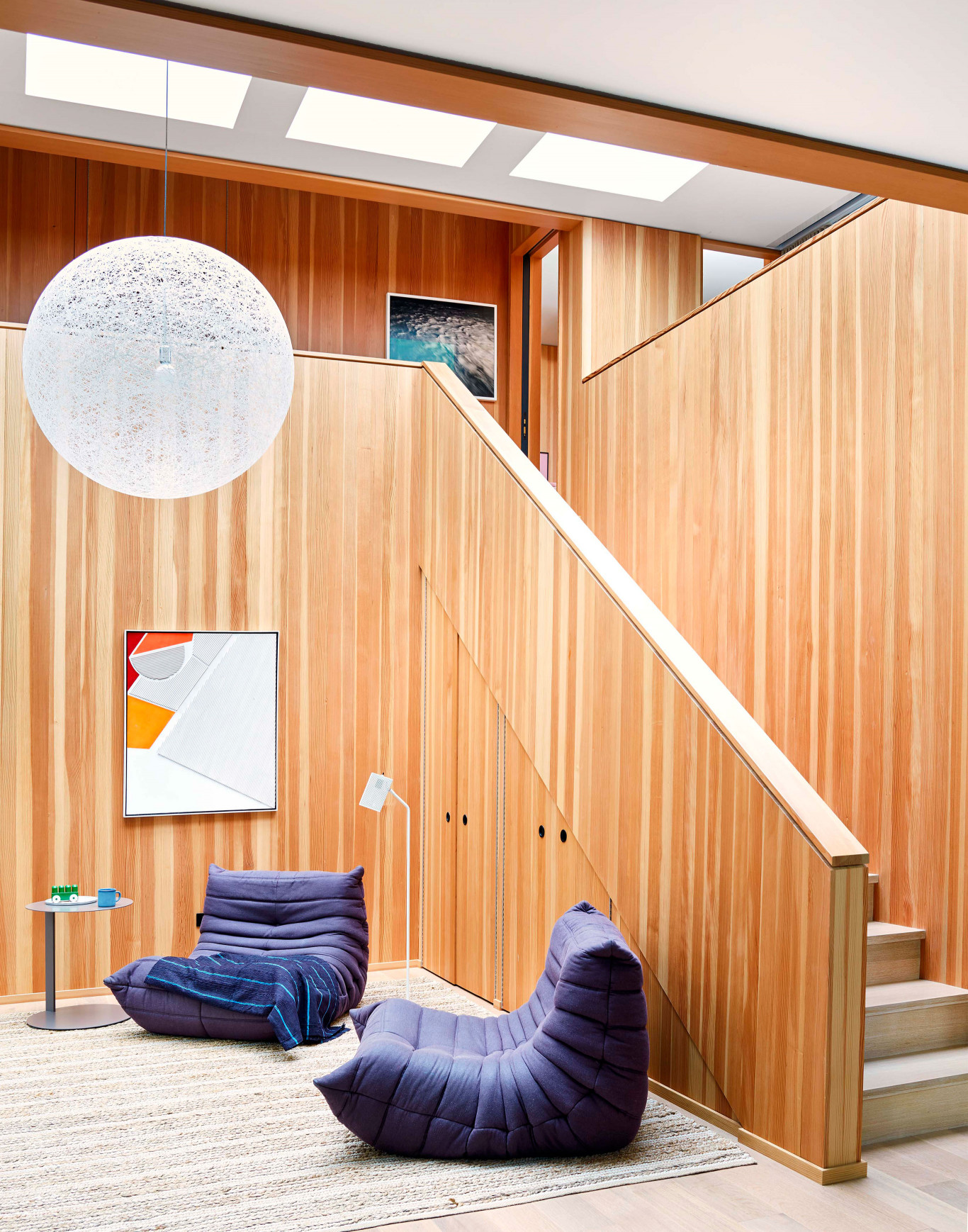 The new material palette and detailing strategy is inspired by our client's nostalgia for her childhood summers spent on Fire Island and by the legacy of some of Fire Island’s great modern architects like Horace Gifford. Douglas fir paneling, oak floors and purple slate tile were selected for their natural color and pattern and provide a warm and durable backdrop for family time.
